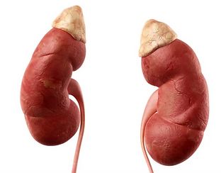The adrenal gland is demonstrated in this diagram to be on top of both kidneys.